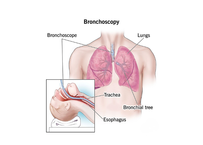 Bronchoscopy is a medical procedure that allows doctors to look inside the airways, including the trachea, bronchi, and lungs, using a thin, flexible tube called a bronchoscope. This instrument has a light and a camera, enabling direct visualization of the airways to detect abnormalities such as tumors, inflammation, infection, or blockages. Bronchoscopy can also be used to collect tissue samples (biopsy), remove mucus or foreign objects, and assist in the placement of stents. It is commonly performed when patients have persistent cough, unexplained lung infections, abnormal imaging findings, or suspected lung cancer.