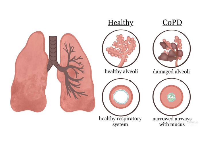 Chronic Obstructive Pulmonary Disease (COPD) is a progressive lung disease that makes it difficult to breathe due to obstruction of airflow in the lungs. It primarily includes two conditions: chronic bronchitis, characterized by long-term cough and mucus production, and emphysema, where the air sacs in the lungs are damaged. COPD is often caused by long-term exposure to irritants such as cigarette smoke, air pollution, chemical fumes, and dust. The disease gradually worsens over time, making simple activities like walking or climbing stairs challenging for affected individuals.