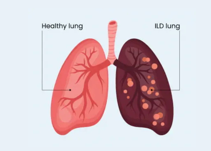 Interstitial Lung Disease (ILD) is a group of lung disorders that cause progressive scarring (fibrosis) of the lung tissue, particularly the interstitium, which is the tissue around the air sacs. This scarring makes it difficult for oxygen to pass into the bloodstream, leading to breathing difficulties and reduced oxygen levels. ILD can result from long-term exposure to environmental pollutants, occupational hazards, autoimmune diseases, certain medications, or may be idiopathic (unknown cause). Common symptoms include persistent dry cough, shortness of breath, fatigue, and chest discomfort. Early diagnosis and management are crucial to slow disease progression and improve quality of life.