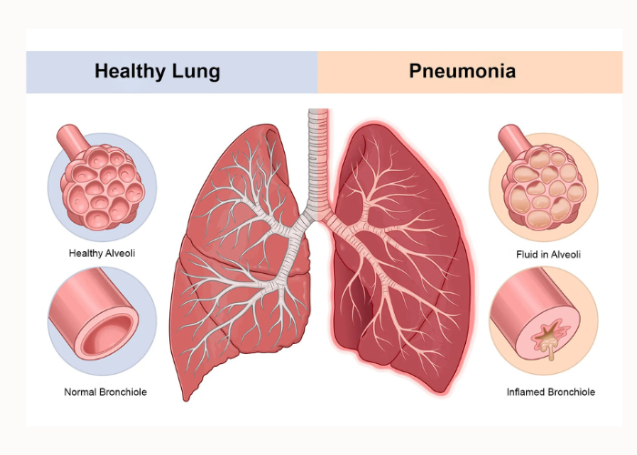 Pneumonia is an infection of the lungs that causes inflammation in the air sacs (alveoli), which may fill with fluid or pus. It can be caused by bacteria, viruses, fungi, or other microorganisms. Common symptoms include cough, fever, chills, shortness of breath, chest pain, fatigue, and sometimes vomiting or confusion in older adults. Pneumonia can range from mild to life-threatening, especially in infants, elderly people, and those with weakened immune systems or chronic illnesses. Early recognition and treatment are critical for preventing serious complications.